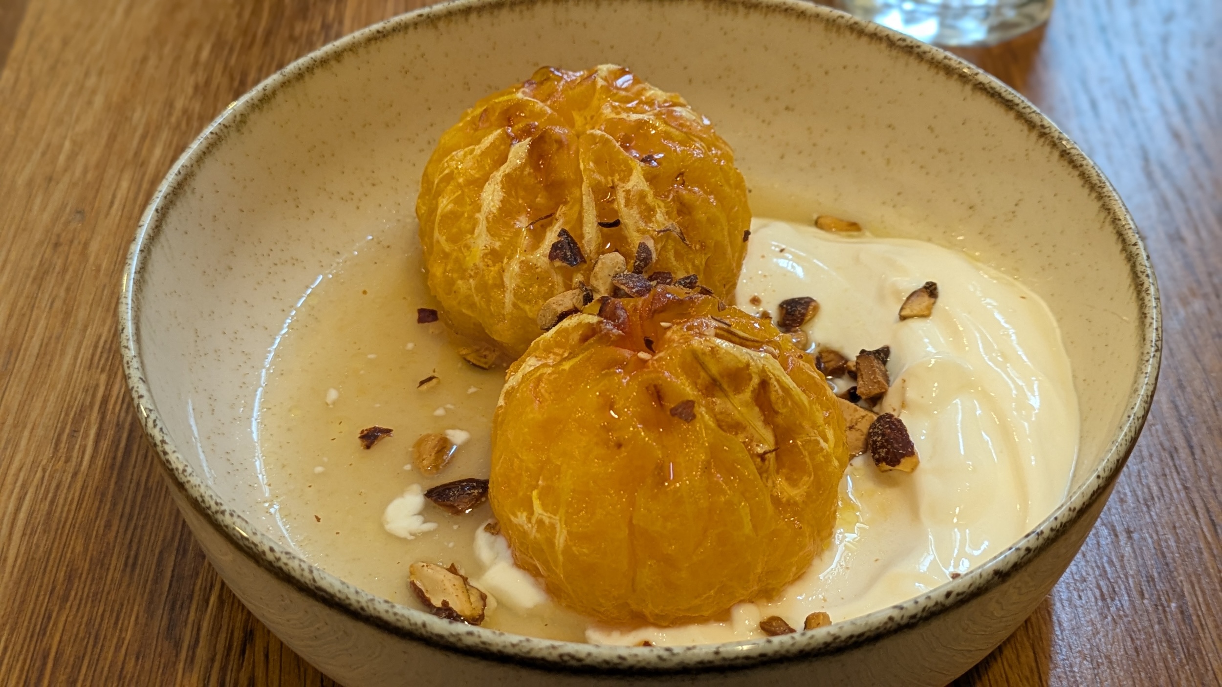 - Clémentine rôtie au miel, yaourt grec & amande