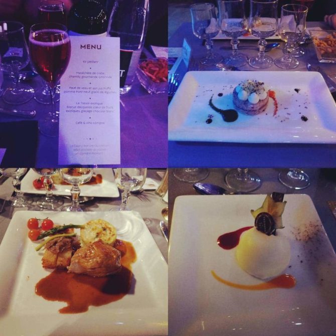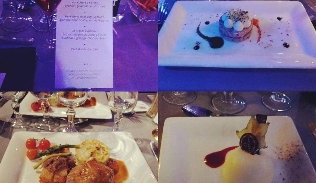 Au programme de cette soirée année 80 au Casino Barrière de Ouistreham, de la musique, du chant, du spectacle et un bon repas. Ce repas fut composé d’un kir pétillant en apéritif. L’entrée est composée d’une maraîchère de crabe et sa chantilly gourmande citronnée. Le plat est un pavé de veau et son jus truffé, pomme Pont-neuf et gratin de légumes. J’ai particulièrement apprécié la viande qui fut tendre et le gratin de légumes. Enfin pour finir le repas, le dessert se nomme “trésor exotique”, biscuit dacquoise, coeur de fruits exotiques et glaçage au chocolat blanc. Un dessert gourmand pour bien finir ce repas très élégant.